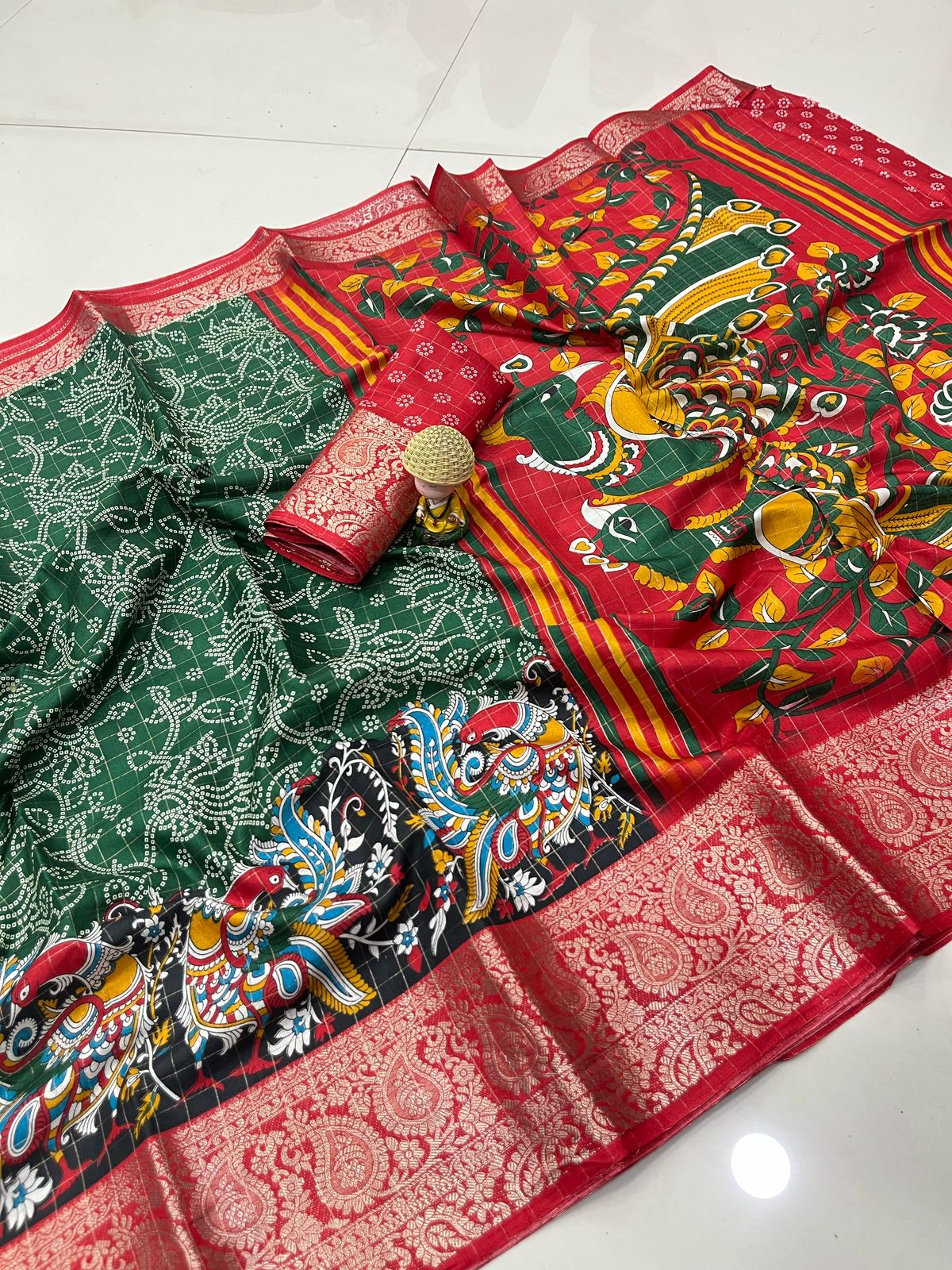 Dola Silk With Jacquard Border With Checks Zari – Designer Print Saree with Rich Pallu